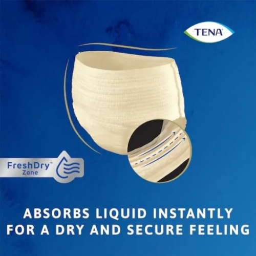 TENA Discreet Plus High Waist Crème blends practical protection with a sophisticated, lingerie-inspired design. Featuring a soft crème colour both inside and out, these disposable incontinence panties are styled with a high waistline for an elegant, feminine silhouette. Designed for moderate to heavy bladder weakness, they provide dependable, discreet protection without compromising on appearance. With triple protection from leaks, moisture, and odour, along with breathable micro-stretch fabric, they offer comfort, flexibility, and peace of mind—no matter what you’re wearing or where you're headed. The high-waisted fit ensures the underwear stays in place throughout the day, while the gentle materials help reduce skin irritation often caused by incontinence products. Available in medium and large sizes, these panties feel like real underwear but protect like TENA.